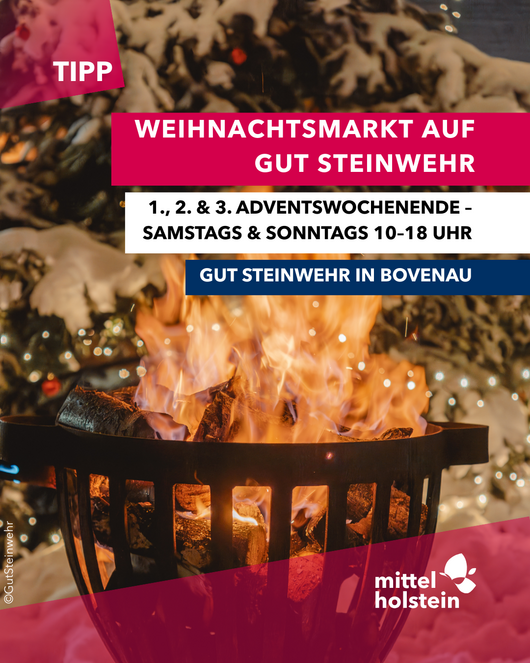 Der Weihnachtsmarkt auf Gut Steinwehr lädt an den Adventswochenenden zu einem stimmungsvollen Ausflug in gemütlicher Gutshofatmosphäre ein. Bis zu 90 Aussteller präsentieren handgefertigte Produkte, weihnachtliche Dekorationen, Textilien und regionale Spezialitäten. Für Familien gibt es ein vielfältiges Angebot mit Ponyreiten und einem großen Kinderland. Neu ist in diesem Jahr ein DIY-Programm für Erwachsene, bei dem Kränze oder Weihnachtsschmuck gestaltet werden können – mit oder ohne Anmeldung.